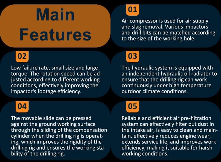 Reverse circulation drilling rig is a new, efficient, environmentally friendly, multifunctional crawler drilling rig. It uses double-wall drill pipes. After the inner tube is discharged, the discharged slag is collected by a cyclone collector. It can be used for sampling and analysis in geological exploration departments.This drilling rig can use compressed air reverse circulation down-the-hole drilling in various strata. The drilling rig's drilling rig lifting, drilling rig compensation, drilling rod loading and unloading, rotation and feeding, outriggers, winches, walking and other actions are all realized by the hydraulic system, which greatly reduces the labor intensity and improves the construction efficiency and engineering quality.